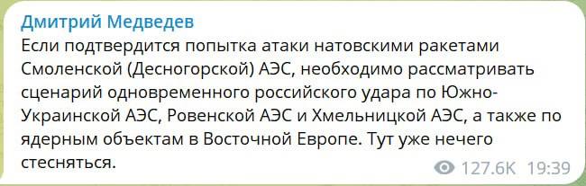 Російські ЗМІ написали про те, що ЗСУ нібито намагалися атакувати ракетами Storm Shadow атомну електростанцію у Смоленській області. Після цього Медведєв заявив, що, якщо підтвердиться «спроба атаки натовськими ракетами» Смоленської (Десногорської) АЕС, необхідно розглядати сценарій одночасного російського удару по Південно-Українській АЕС, Рівненській АЕС та Хмельницькій АЕС, а також по ядерних об'єктах у Східній Європі.