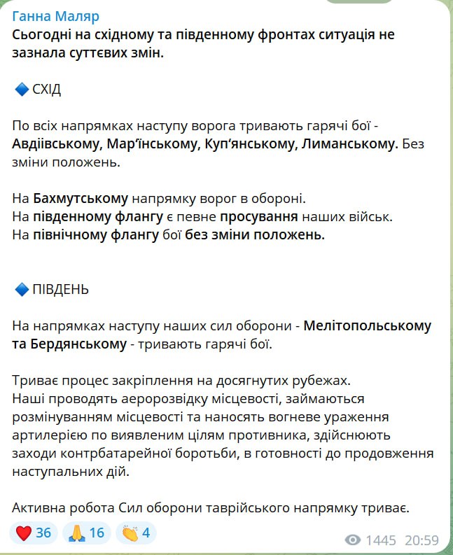 На Мелітопольському та Бердянському напрямках, за її словами, тривають гарячі бої, триває процес закріплення на досягнутих рубежах. Просування немає.