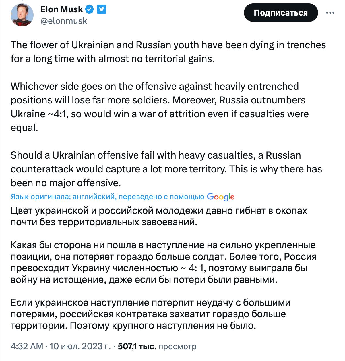 "Колір української та російської молоді давно гине в окопах майже без територіальних завоювань. Яка б сторона не пішла в наступ на сильно укріплені позиції, вона втратить набагато більше солдатів. Більше того, Росія перевершує Україну чисельністю приблизно 4 до 1, тому виграла б війну на виснаження, навіть якби втрати були б рівними. Якби український наступ зазнав невдачі з великими втратами, російська контратака захопить набагато більше території. Тому великого наступу не було", - пише Маск у Твіттері.