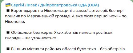 07.32 Вночі росіяни вдарили по Нікопольщині із важкої артилерії. Увечері по Марганецькій громаді. Після години ночі – Нікополем.