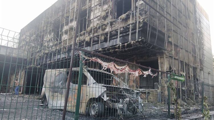 На фото можна побачити, що будівля повністю знищена вогнем. Також згоріло вісім легкових автомобілів.