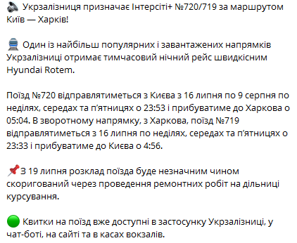 - з Києва поїзд №720 відправлятиметься з 16 липня по 9 серпня у неділю, середу та п'ятницю о 23:53 та прибуватиме до Харкова о 05:04;