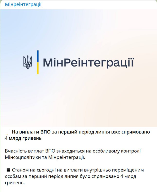 На виплати тимчасово переміщеним особам за перший період липня скеровано 4 млрд гривень.