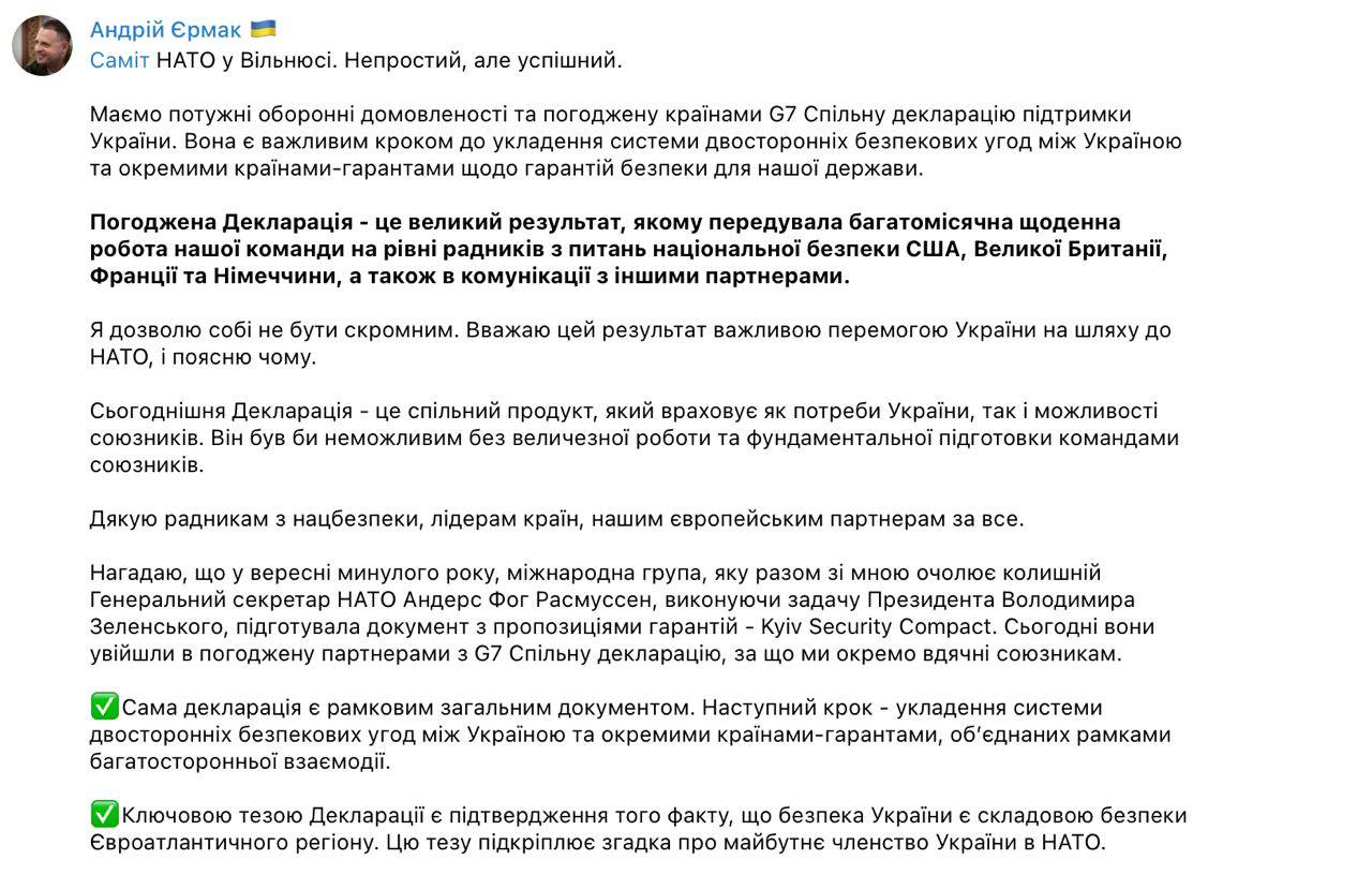 Важливо перемогти до наступного саміту НАТО. Єрмак вважає успішним результат у Вільнюсі