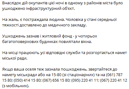 Голова Запорізької обласної військової адміністрації Юрій Малашко повідомив, що у Запоріжжі через ворожу атаку дронів поранення отримав 62-річний чоловік. Загалом РФ здійснила 45 обстрілів у мирних містах та селах за минулу добу. Зафіксовано 27 руйнувань об'єктів житлової та соціальної інфраструктури у 15 населених пунктах Запорізької області.