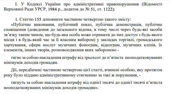 Автори пропонують доповнити Кодекс про адміністративні порушення новим становищем, в якому йдеться про те, що використання забороненого музичного продукту (фонограм, відеограм, музичних кліпів, їх елементів) тягне за собою штраф від 300 до 500 неоподатковуваних мінімумів. За повторне порушення загрожує штраф від 1000 до 1500 неоподатковуваних мінімумів.