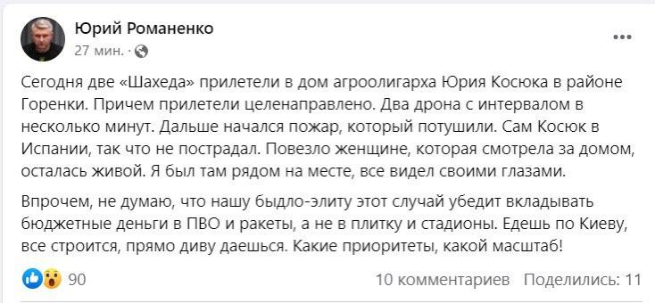 "Сьогодні два "Шахеди" прилетіли до будинку агроолігарха Юрія Косюка в районі Горенки. Причому прилетіли цілеспрямовано. Два дрони з інтервалом у кілька хвилин. Далі почалася пожежа, яку загасили. Сам Косюк в Іспанії, так що не постраждав. Пощастило жінці, яка дивилася за будинком, залишилася живою. Я був там поряд на місці, все бачив на власні очі", – написав Романенко.