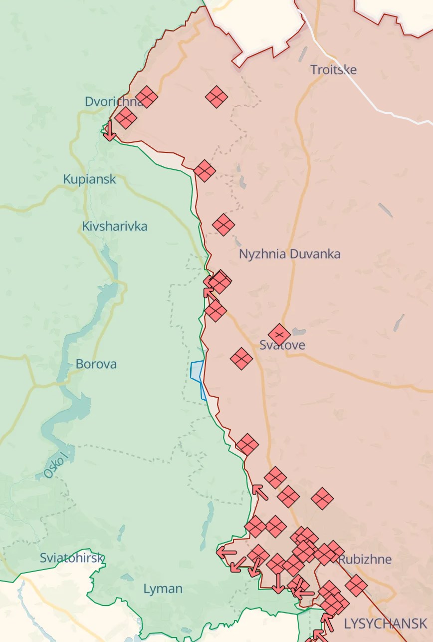 Російські паблики пишуть, що фронт у лиманському напрямі стабілізувався, оскільки ЗСУ кинули туди резерви. Ближче до Сватового основні бої йдуть за Новоселівське. Також росіяни продовжують чинити тиск на північний схід від Куп'янська.