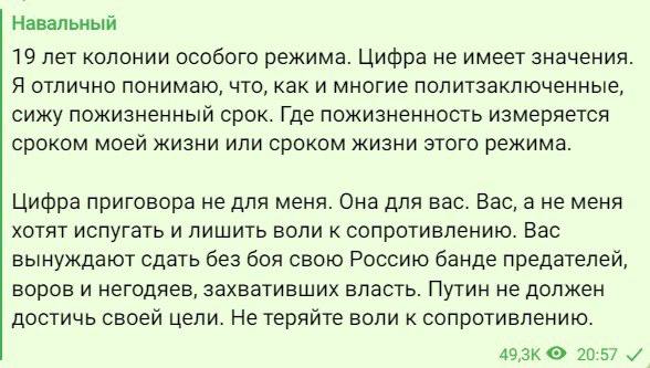 "19 років колонії особливого режиму. Цифра не має значення. Я чудово розумію, що, як і багато політв'язнів, сиджу довічний термін. Де довість вимірюється терміном мого життя або терміном життя цього режиму. Цифра вироку не для мене. Вона для вас. Вас, а не мене хочуть злякати та позбавити волі до опору. Вас змушують здати без бою свою Росію банді зрадників, злодіїв та негідників, які захопили владу. Путін не повинен досягти своєї мети. Не втрачайте волі до опору", - написав Навальний.