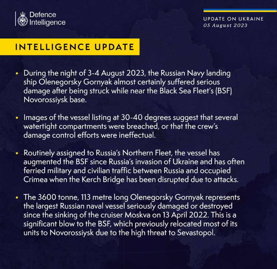 "Оленегірський гірник" вагою 3600 тонн і довжиною 113 метрів є найбільшим військово-морським судном Росії, серйозно пошкодженим або знищеним після потоплення крейсера "Москва" 13 квітня 2022 року. Це значний удар по ЧФ, який раніше передислокував більшу частину своїх підрозділів до Новоросійська через високу загрозу Севастополю", - йдеться в повідомленні.