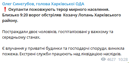 Війська РФ сьогодні близько 9:20 обстріляли Козачою Лопань Харківського району, постраждали двоє чоловіків, їх госпіталізовано.
