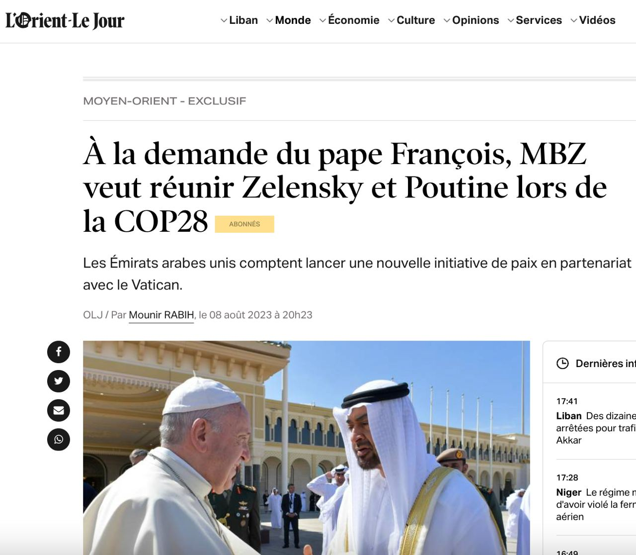 Президент Об'єднаних Арабських Еміратів Мухаммад бін Заїд має намір організувати зустріч Президента України Володимира Зеленського та Володимира Путіна у рамках майбутньої конференції ООН зі зміни клімату COP28.