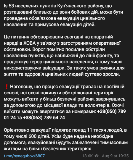Синегубов допустив обов'язкову евакуацію із 53 населених пунктів Куп'янського району. Фото: Facebook