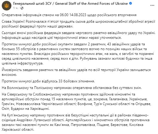 Минулої доби російські окупанти завдали 2 ракетних, 43 авіаційних удару і близько 55 обстрілів з РСЗВ.