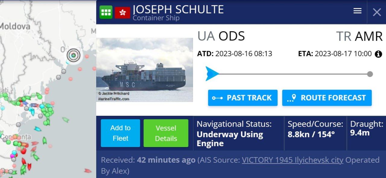 Контейнеровоз "JOSEPH SCHULTE" під прапором Гонконгу, що знаходився в одеському порту з 23 лютого минулого року, вийшов за Воронцовський маяк і тримає курс на Босфор. На борту – понад 30 тис. тонн вантажу (2114 контейнерів), у тому числі з продовольством.