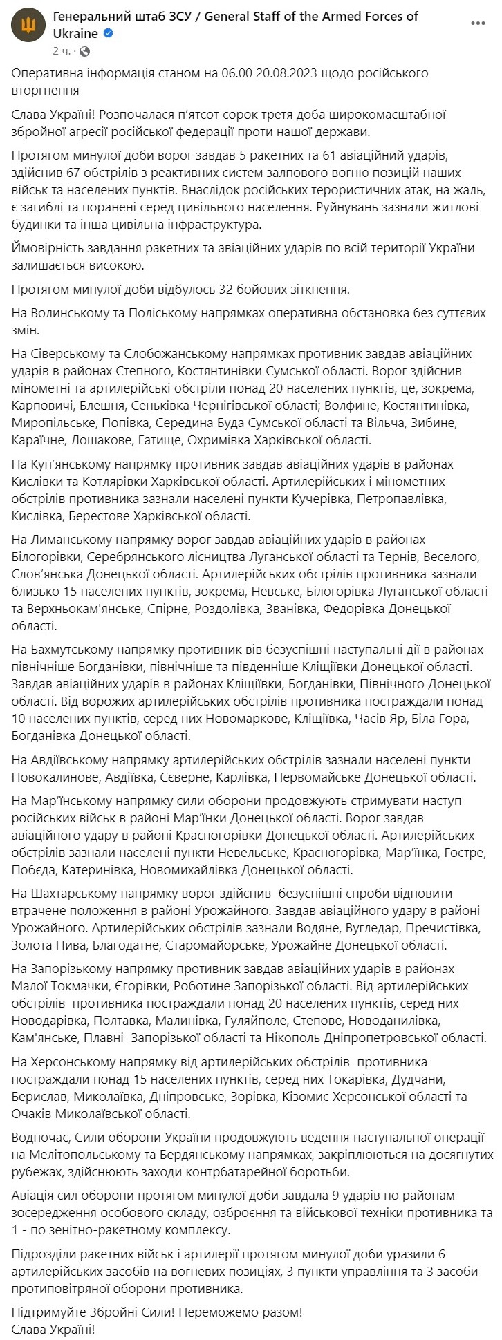 09:40 Минулої доби росіяни завдали 5 ракетних та 61 авіаційний удар, здійснили 67 обстрілів з реактивних систем залпового вогню за позиціями наших військ та населеними пунктами. Протягом минулої доби сталося 32 бойові зіткнення.