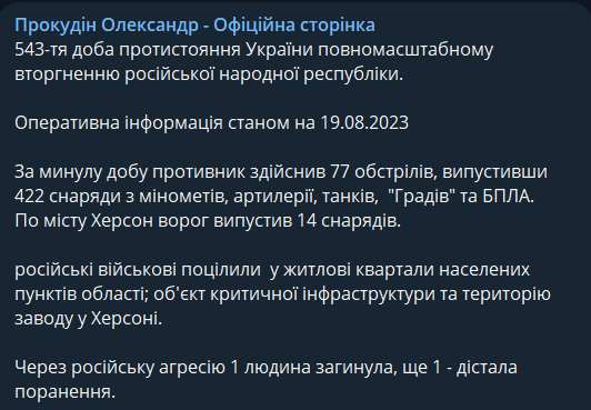 09:10 Минулої доби росіяни 77 разів обстріляли Херсонську область, випустивши 422 снаряди з мінометів, артилерії, танків, "Градів" та БПЛА. Містом Херсон ворог випустив 14 снарядів.