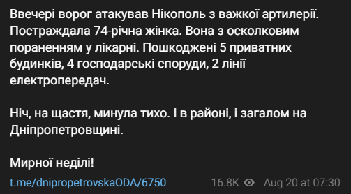У суботу ввечері, 19 серпня, росіяни атакували Нікополь Дніпропетровської області із важкої артилерії. Внаслідок обстрілу є постраждала жінка.