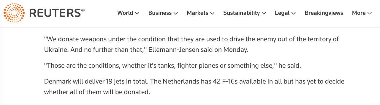 "Ми передаємо зброю за умови, що вона використовується для витіснення ворога з території України. І нічого більше. Такі умови, чи то танки, винищувачі, чи щось ще. Це сигнал, який Україна, звичайно ж, отримає", - наводить слова. міністра Reuters.