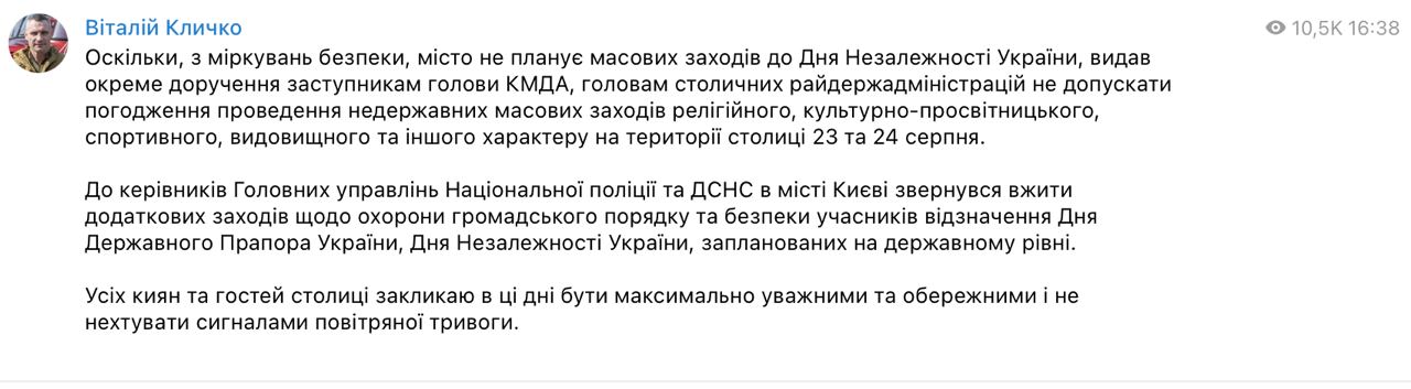 Зазначимо, що, за заявою КМДА, у Києві не буде масових заходів на День Незалежності. Кличко заборонив їх узгоджувати. Це рішення ухвалено після того, як у суботу російська ракета вдарила за місцем проведення заздалегідь анонсованої виставки дронів у Чернігові.