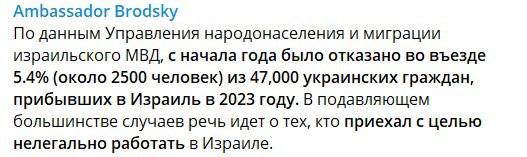 За словами дипломата, з початку року із 47 тисяч українських громадян, які намагалися в'їхати до Ізраїлю, було відмовлено лише двом із половиною тисячам. Бродський додав, що у більшості випадків йшлося про "боротьбу зі спробами нелегального працевлаштування на ізраїльській території".