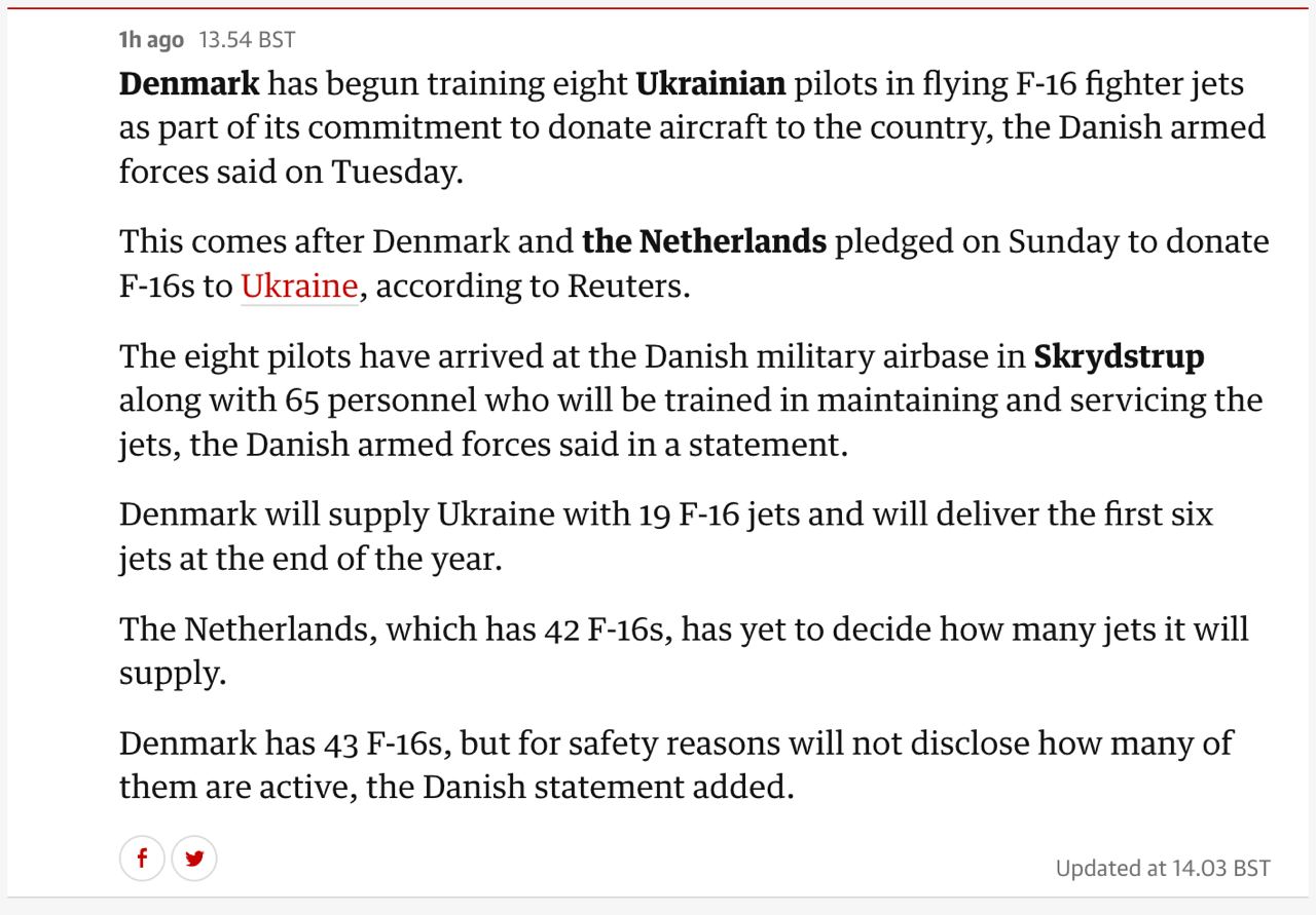 Нагадаємо, Данія поставить Україні 19 літаків F-16. Перші шість прибудуть уже наприкінці цього року. Ще вісім буде відправлено протягом 2024 року, а 2025-го - ще п'ять машин.