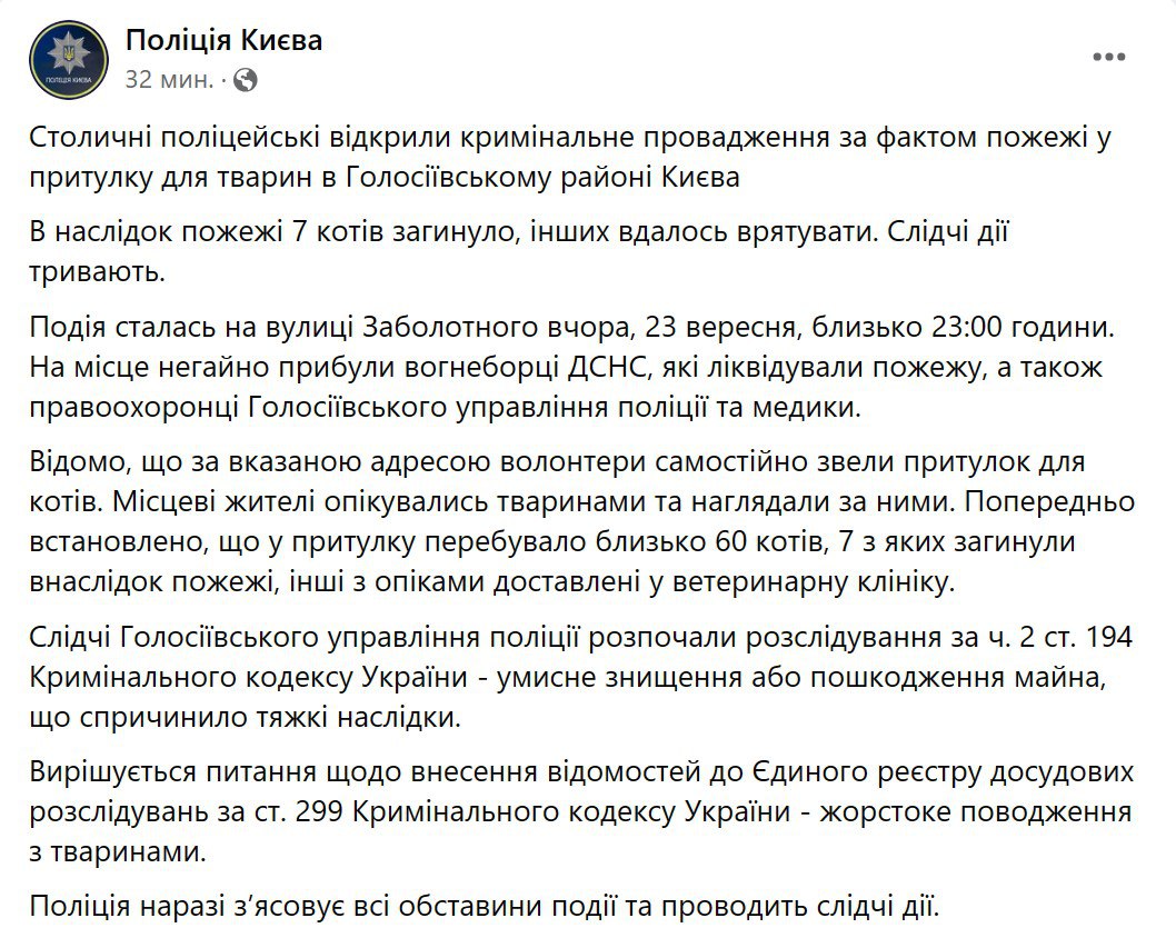 Київська поліція порушила кримінальну справу після ймовірного підпалу котячого притулку.