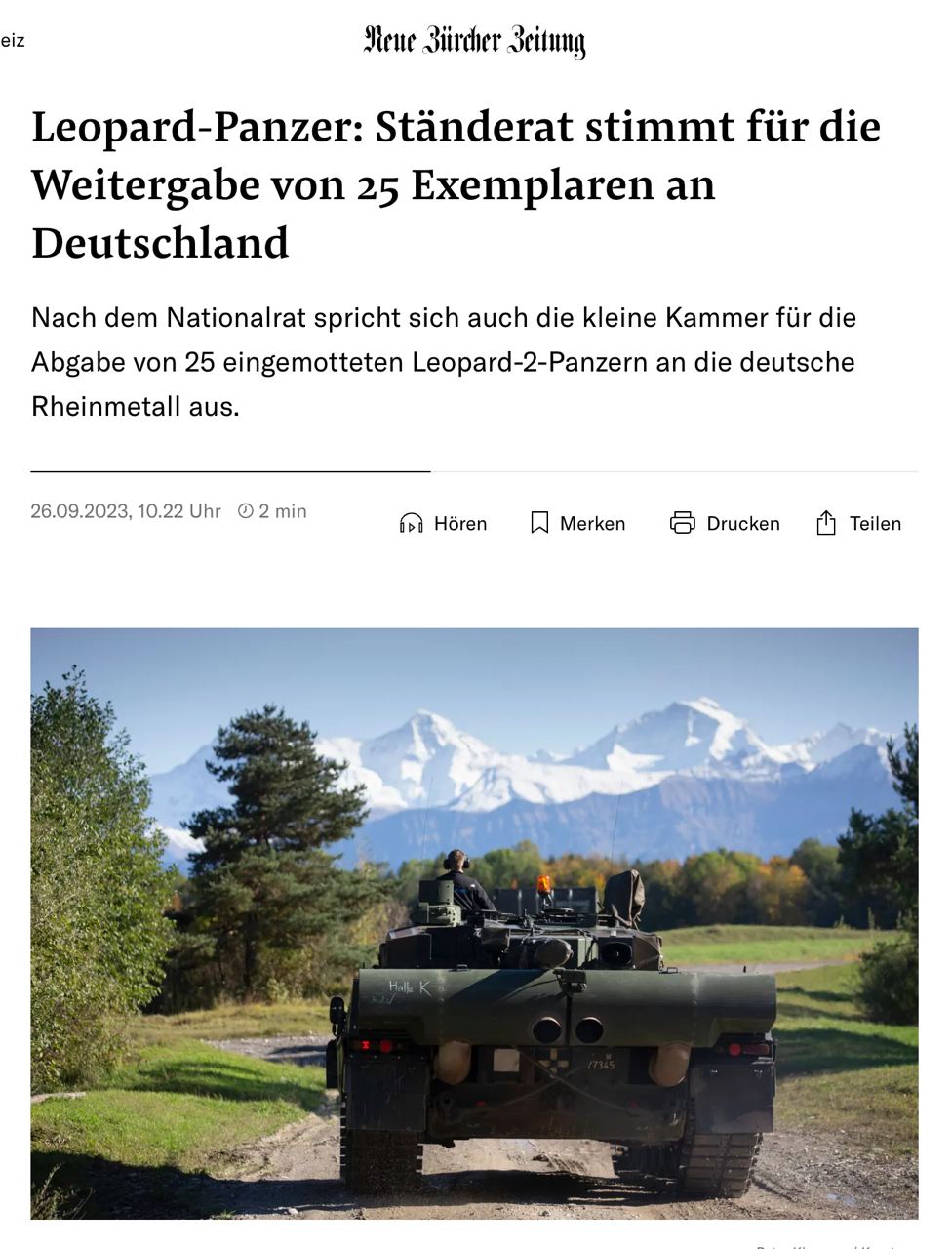 12:33 Парламент Швейцарії остаточно схвалив виведення з експлуатації 25 танків Leopard 2 для подальшого продажу німецької компанії Rheinmetall, повідомляє місцева газета Neue Zürcher Zeitung.