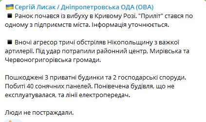 Інших обстрілів у Криворізькому районі не було. У Кривому Розі уся важлива інфраструктура, комунальний транспорт, соціальні та медичні установи працюють стабільно.
