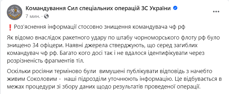 "Як відомо, в результаті ракетного удару по штабу Чорноморського флоту РФ було знищено 34 офіцери. Наявні джерела стверджують, що серед загиблих командувач ЧФ РФ. Багатьох досі так і не вдалося ідентифікувати через розрізненість фрагментів тіл", - йдеться у повідомленні..