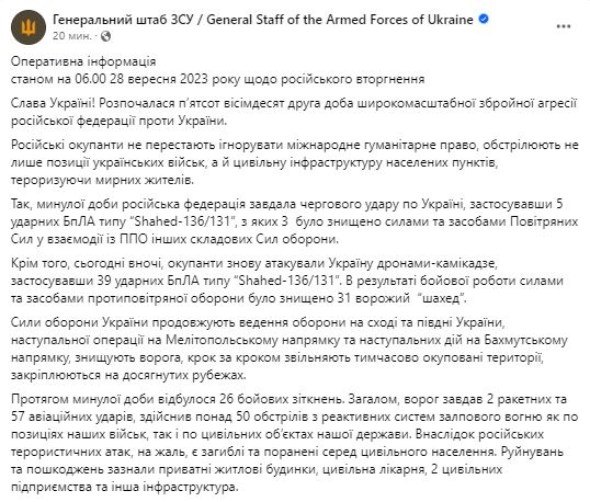 Вранці 28 вересня Генштаб ЗСУ оприлюднив зведення про ситуацію на фронті.