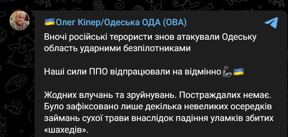 "Наші сили ППО відпрацювали на відмінно. Жодних попадань та руйнувань. Постраждалих немає. Було зафіксовано лише кілька невеликих вогнищ загоряння сухої трави внаслідок падіння уламків збитих "шахедів", - написав голова Одеської ОВА Олег Кіпер.
