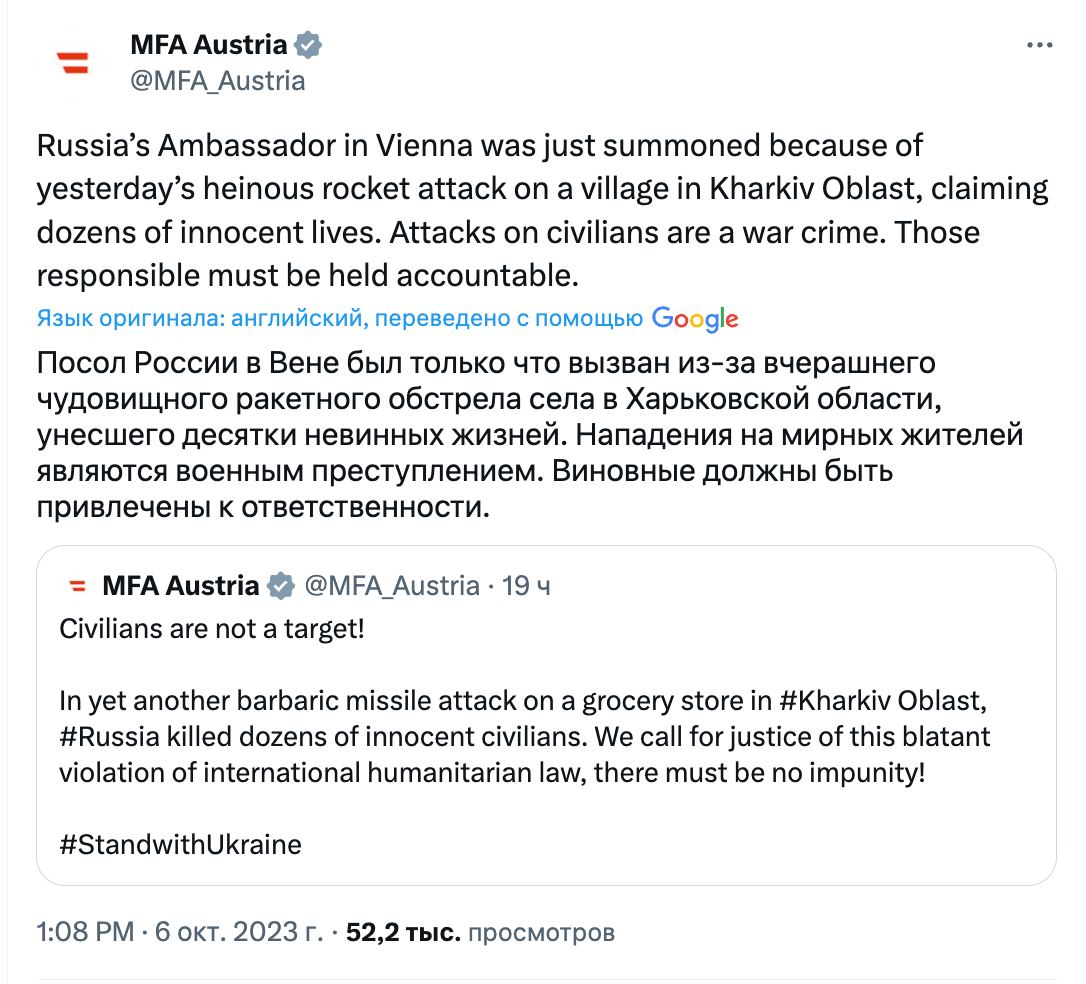 Австрія викликала до Міністерства закордонних справ посла РФ через вчорашній "жахливий" ракетний удар по кафе в селі Гроза Харківської області, де жителі зібралися на поминки.