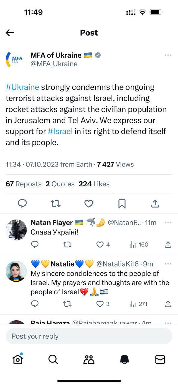 "Україна рішуче засуджує терористичні атаки, що продовжуються, на Ізраїль, у тому числі ракетні обстріли мирного населення Єрусалима і Тель-Авіва. Ми висловлюємо підтримку Ізраїлю в його праві на захист себе і свого народу", - вказується в повідомленні в соцмережі X.