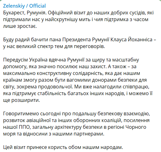 "Насамперед Україна вдячна Румунії за щиру та масштабну допомогу, яка значно посилює наш захист. А також – за максимально конструктивну солідарність, яка дозволяє нашим країнам разом бути вагомими донорами безпеки для миру, зокрема продовольчої. Ми вже налагодили співпрацю, яка підтримує стабільність багатьох інших народів і можемо його ще розширити", - написав президент.