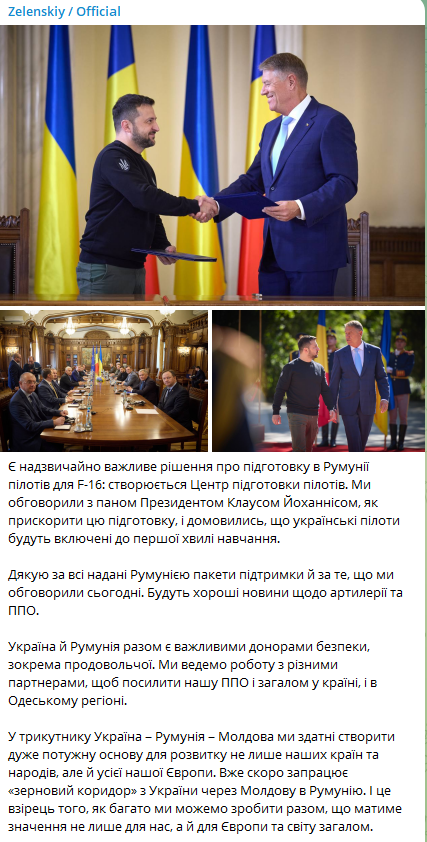 "Є надзвичайно важливе рішення про підготовку в Румунії для F-16. Створюється центр підготовки пілотів. Ми обговорили, як прискорити таку підготовку, і домовилися, що українські пілоти будуть включені до першої хвилі навчання", - повідомив президент України після зустрічі з румунським колегою. Клаусом Йоханнісом.