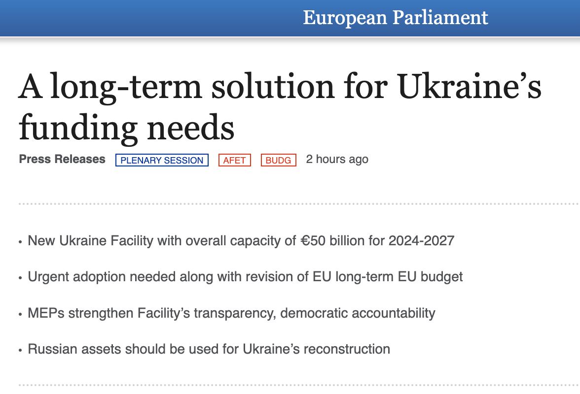 Європарламент схвалив у першому читанні створення фонду Ukraine Facility на 50 млрд євро. Це новий фінансовий інструмент ЄС щодо виділення Україні грантів та кредитів для відновлення, реконструкції та модернізації країни у 2024-2027 роках, який передбачає виконання Києвом певних реформ.