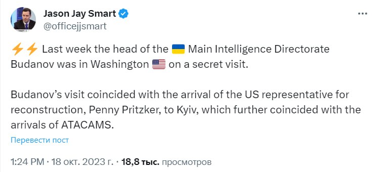 "Візит Буданова збігся з приїздом до Києва представника США з відновлення Пенні Пріцкер, що надалі збіглося з прибуттям ATACAMS", - написав він.