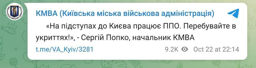 22:40 Про роботу ППО під Києвом повідомляє голова Київської міської військової адміністрації.