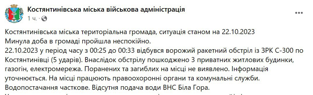 11:35 Вночі було п'ять ударів по Костянтинівці Донецької області. Стріляли із комплексу С-300.