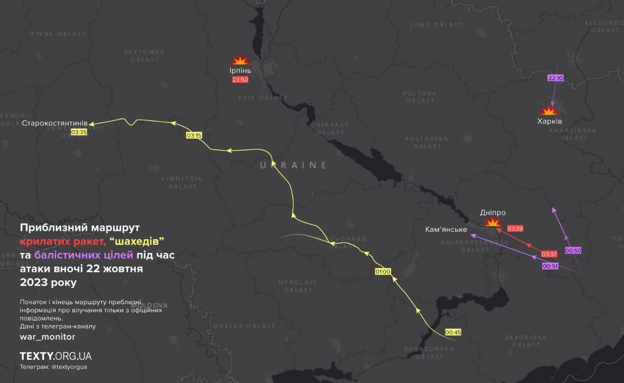 14:06 Приблизний маршрут ракет та "Шахедів" під час нічної атаки Україною.
