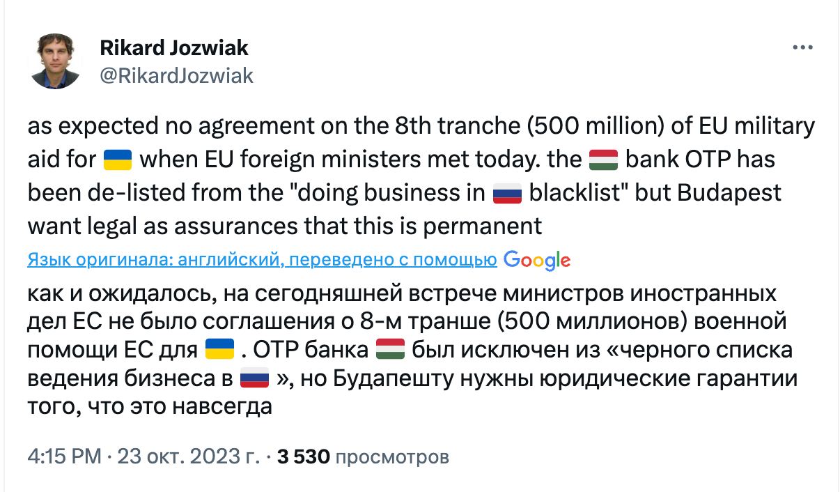 Як і очікувалося, на сьогоднішній зустрічі міністрів закордонних справ ЄС не було угоди про восьмий транш (500 мільйонів) військової допомоги ЄС для України. ", - сказано у посту журналіста.