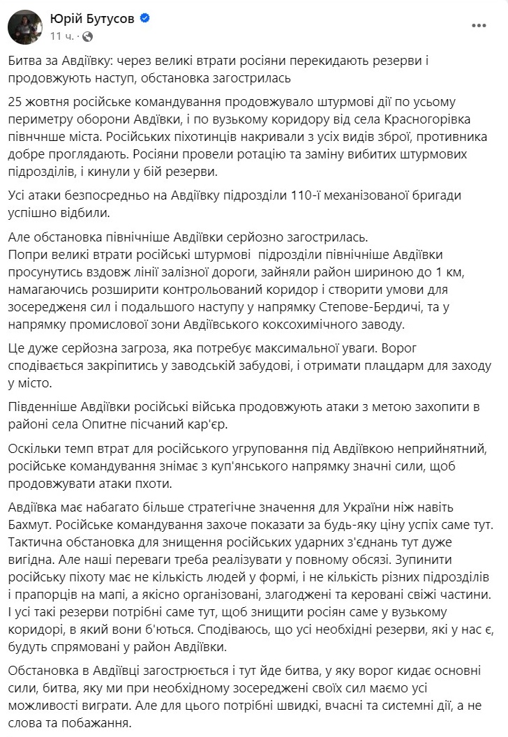 При цьому військовий оглядач Юрій Бутусов пише, що росіянам на північ від Авдіївки вдалося просунутися вздовж залізничної колії та зайняти район завширшки до кілометра.