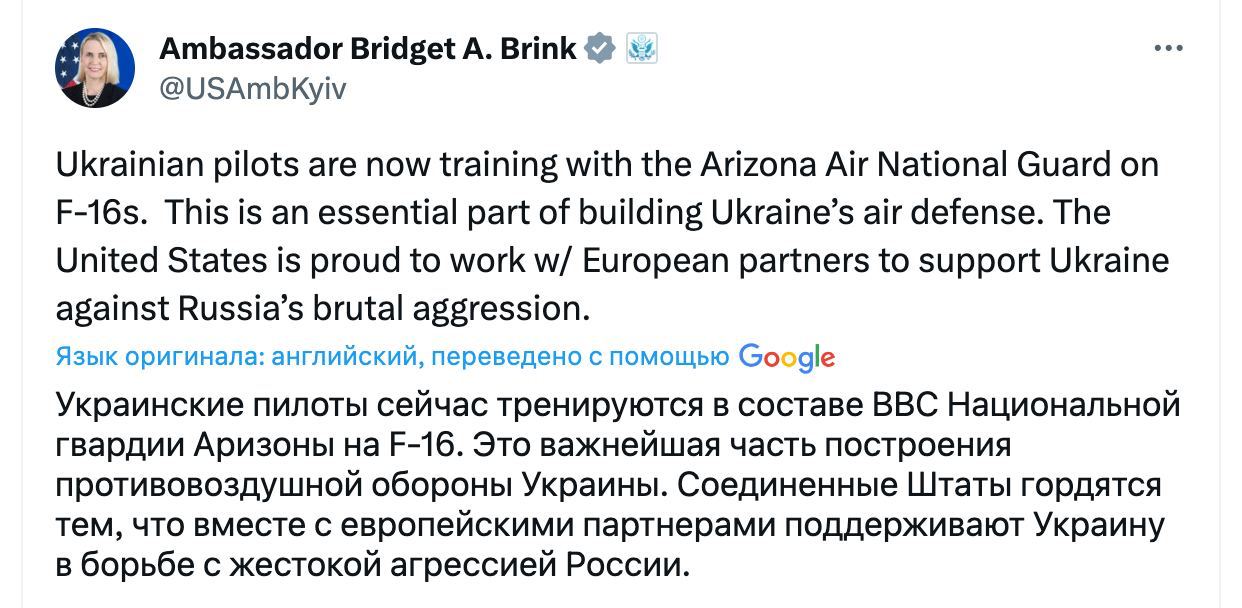 "Українські пілоти зараз тренуються у складі ВПС Національної гвардії Арізони на Е-16. Це найважливіша частина побудови протиповітряної оборони України. Сполучені Штати пишаються тим, що разом із європейськими партнерами підтримують Україну у боротьбі з жорстокою агресією Росії", - написала посол.