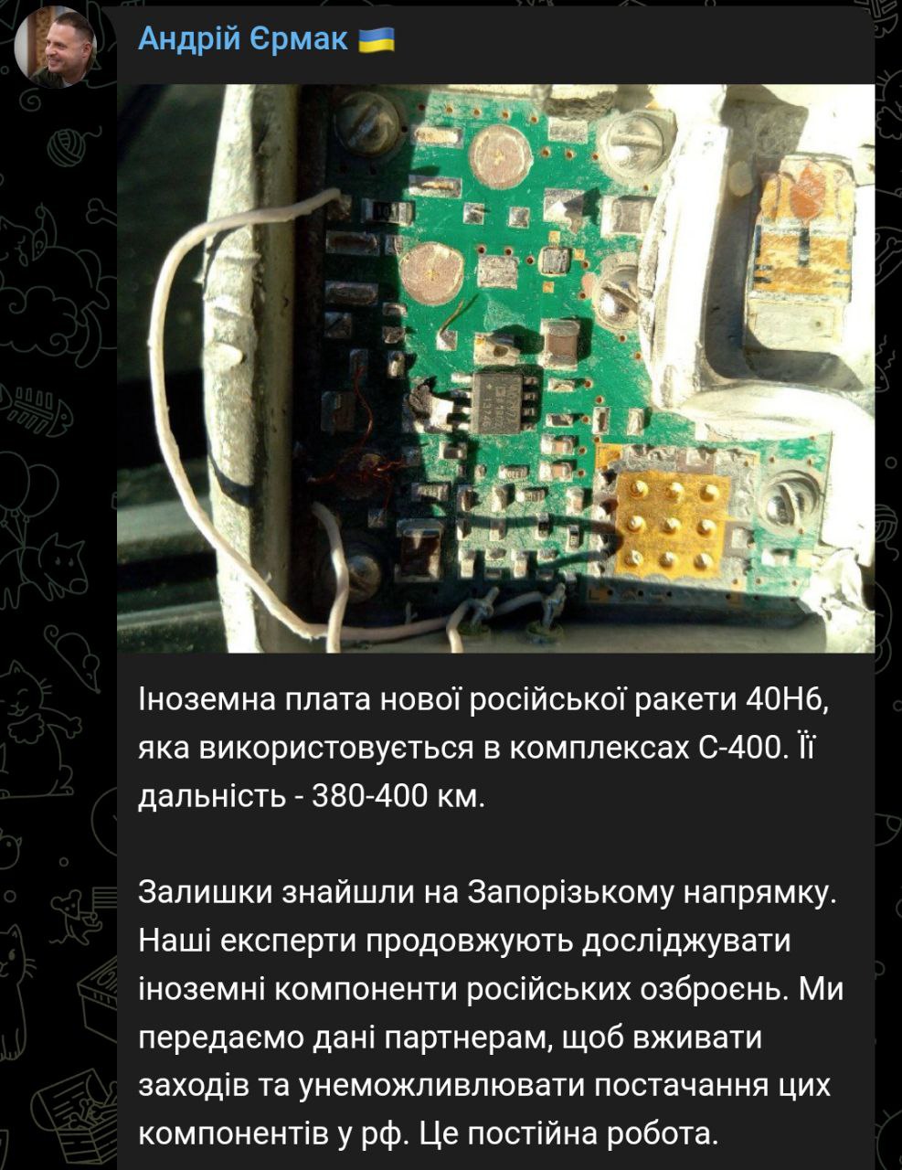 12.15 У російській далекобійній ракеті із комплексу ППО С-400 знайшли іноземну плату, повідомив Єрмак. Її залишки було знайдено на Запорізькому напрямку.