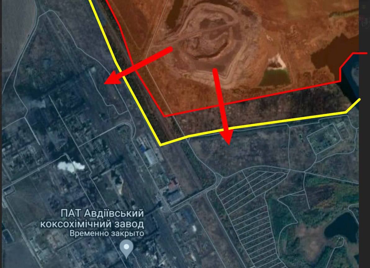 За інформацією українських військових телеграм-каналів, основні бої зараз відбуваються на іншому фланзі – з південного напрямку. Раніше вони розповідали, що бої наблизилися до промзони Авдіївського коксохімзаводу з боку захопленого росіянами терикона.