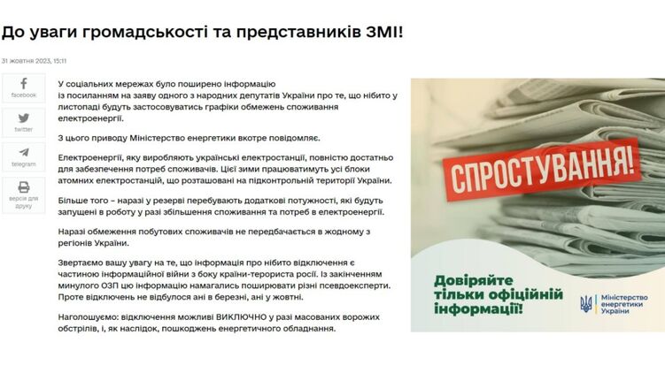 Повідомлення про майбутні планові відключення світла в Україні міністерство назвало частиною інформаційної війни з боку Росії.