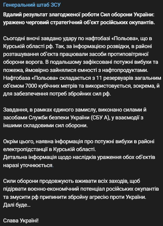 У Генштабі ЗСУ підтвердили нічний удар по нафтобазі в Курській області Росії