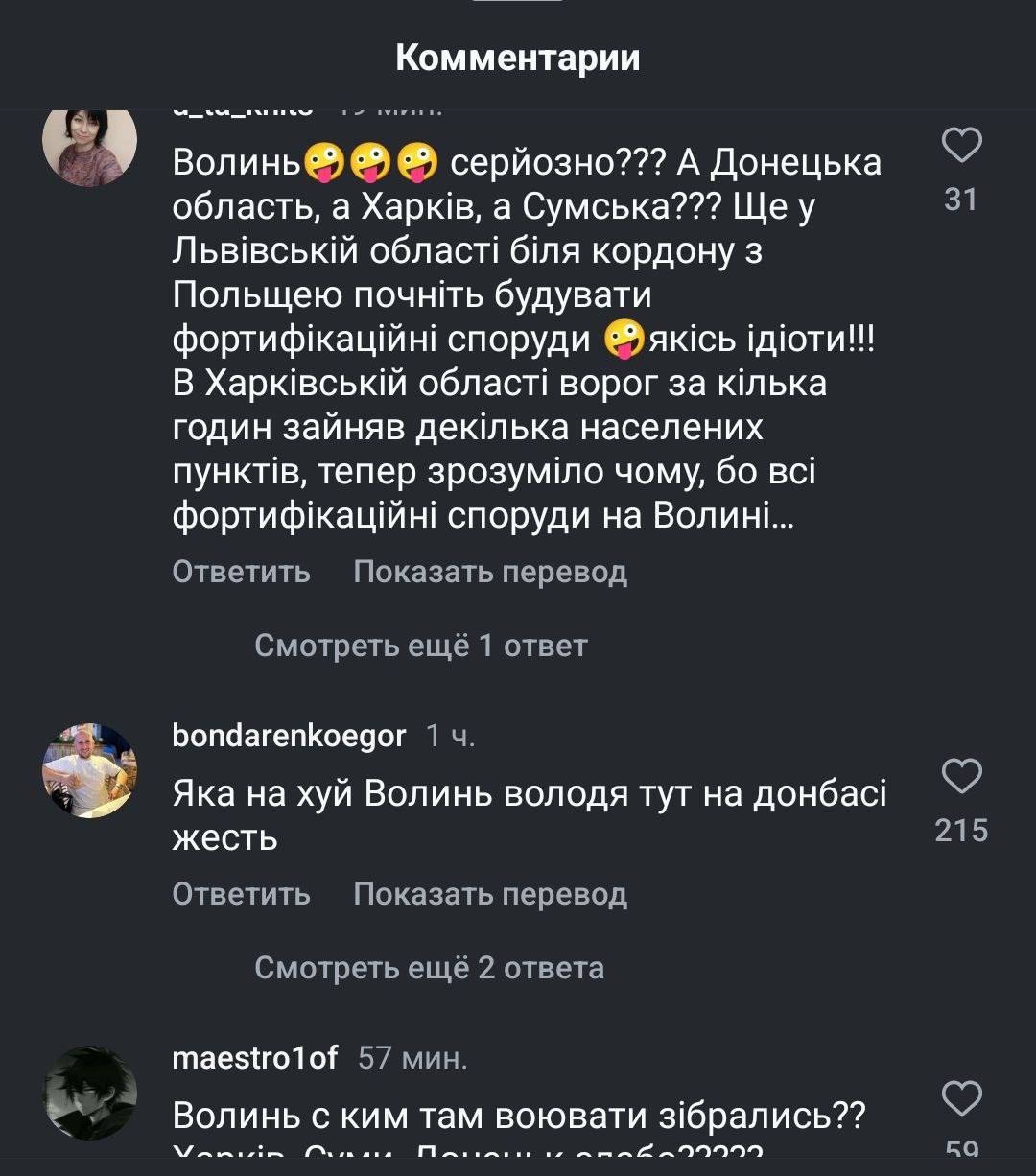 • "Волинь, серйозно? А Донецька область, а Харків, а Сумська? Ще у Львівській області біля кордону з Польщею почніть будувати. У Харківській області ворог за кілька годин зайняв кілька населених пунктів, тепер зрозуміло чому: бо всі фортифікаційні споруди на Волині…"