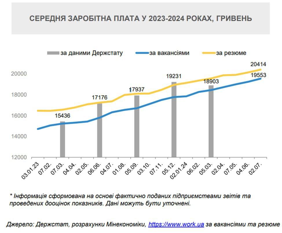 Середня зарплата в Україні стабільно зростає і у першому кварталі 2024 року становила 18 903 грн. Про це повідомляє Міністерство економіки.